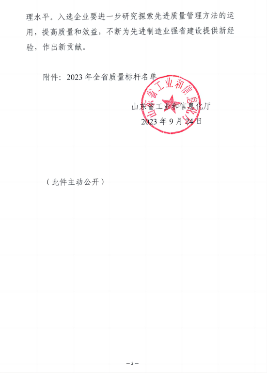 意昂体育于2023年9月24日获得山东省工业和信息化厅发布的全省质量标杆荣誉认定。